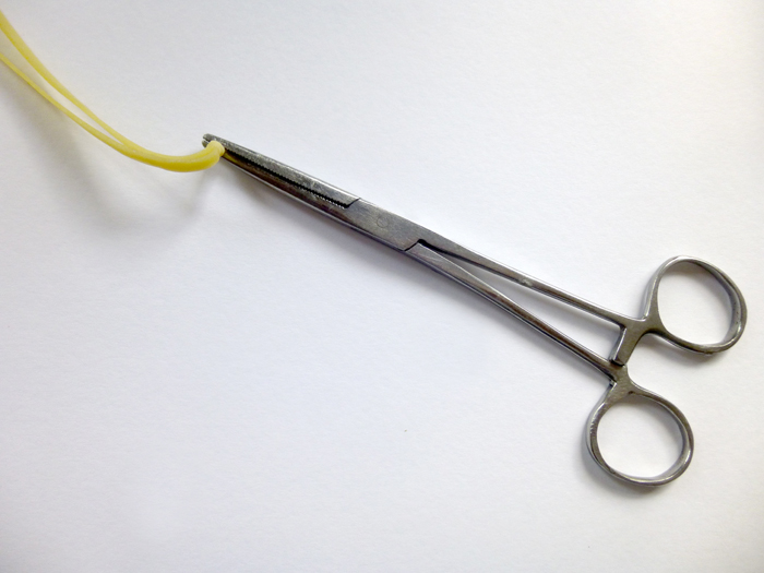 The best way I have found for tying knots in motors is shown in the photo above left. I clip the two ends into the pair of cheap forceps (from Proops or similar), locking the forceps. I lube the motor and then tie a simple overhand knot going left to right.