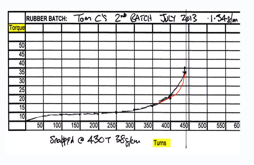 This is perhaps the most neglected area when it comes to getting the best out of a specific piece of rubber. Most fliers (including me until I took up F1D) believe that the factor which determines model performance is simply how many turns you can pack onto a motor. So what tends to happen is that they use a bigger motor than is neccessary and then pack on the turns. They watch the model shoot up to the roof and think that they are getting a good flight. They don't appear to notice that the model comes down equally quickly once the turns have spun off very fast. You can actually get a much longer time by winding up fully and then winding off some of the turns to reduce the initial torque. This can be a puzzle. How can you get more by taking turns off? The answer lies in understanding how rubber behaves when it is wound and when it unwinds.